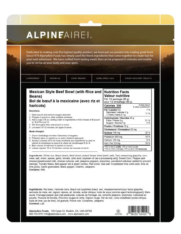 - Ingredients: white rice, black beans, beef diced cooked freeze dried (beef, salt), taco seasoning [paprika, corn meal, salt, onion, spices, garlic, tomato, citric acid, soybean oil (as a processing aid)], sweet corn, pepper jack cheese [(pasteurized milk, cheese cultures, salt, jalapeno peppers, enzymes), powdered cellulose (added to prevent caking)], tomato flakes, bell pepper red & green combo, red onion, sea salt, crystallized lime (citric acid, lime oil, lime juice), garlic granulated, black pepper, cilantro, jalapeno